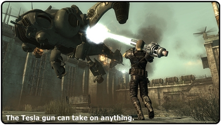 The objectives are based around trying to wipe out the Enclave as a new member of the Brotherhood of Steel, starting off with an assault on one of the Enclave bases with the assistance of the Brotherhood and Optimus… sorry, Liberty Prime. The other missions involve stealing a new weapon, the Tesla Coil (you’ll like this one) and heading off to a huge airfield base occupied by the Enclave.