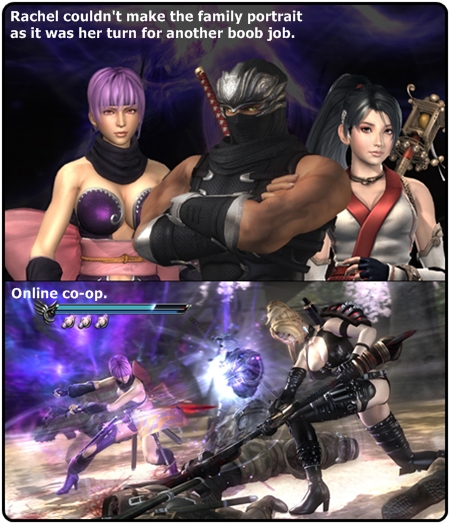 There are some extra female characters to play as during specific chapters. Momiji uses a halberd and bow and arrow setup and plays similarly to Ryu, but with just the one weapon. Rachel is the slower one with a giant mallet that does some brutal damage at the expense of speed. Ayane from the Dead or Alive games is the nippy one with short swords that zips around the screen like a pink and purple wasp.