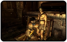 You’re put to work too (remember you’re an undercover slave) by the slavers. You’re given an auto-axe to fend for yourself and shoved outside in your gimpy outfit into the Steelyard to collect Steel Ingots. You only need ten to complete the task but there over 100 out there. It’s worth looking for as many as possible because you get rewarded for every ten you find with weapons and armour that make the later arena gladiatorial matches an absolute sinch.