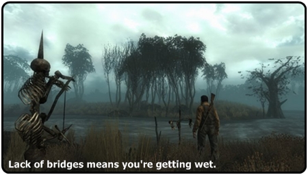 The majority of this substantial map is made up of swamps populated with rednecks, mirelurks, tribesmen, ghouls, toxic bogs and enough radiated water to wade through to guarantee the vault dweller will never have (normal) children.