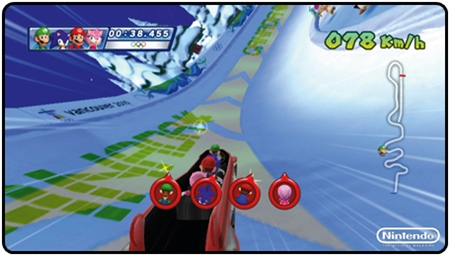 In a smart move, Sega have allowed the Wii Fit balance board to be used in some events, just in a separate single player ones though and not in the main game. The best use of this is for the Bobsleigh or Skeleton events where you can sit on it and lean around corners. Kids will love it and reclaim the Wii from their Wii Fit loving mums. The only thing missing is the chance to hop onto the board after the initial sprint; this is replaced by a button press. So you might as well start sitting on it. You can’t help but feel Sega missed a bit of a trick here, but safety might have been a concern. You could always put a few extra moves in just for fun, such as lying on the board for the Skeleton events (probably works better if you’re a small child). Multiplayer Bobsleigh is fun though with the wiimotes, as you all have to line up and lean at the same time.