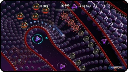 Levels are completed by reaching a set goal. This might be collecting all the stars or maybe defeating all the enemies. Finding all the stars can be tricky on the larger levels. But at least the map, tiny as it is, shows their locations. Later levels will include locked zones where you need to find a colour-coded key, or you’ll need to find all the fragmented pieces of an Equilbrix (a large star). Keep a careful eye out for the dangers of these space mazes. Insta-kill spiked walls, mines and creeper drones are all eager to destroy you.