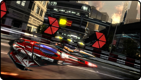 The music will feature some remixed tracks from the original WipEout, including the likes of Orbital, Leftfield and Underworld, and other artists including Death Mouse will provide newer tracks. Never mind the tunes though; they’ll have to be amazing to avoid being switched off in favour of the incredible sound effects. This is shaping up to be the best sounding WipEout game yet. Thanks to the racing vehicles comparatively prototype nature, the engine noise is hungry for power and louder than the smooth sophisticated sci-fi hum of before. There’s a dangerous whining noise that chases your ears around the track, in fact, it reminded me of a passing Speeder Bike from Return of the Jedi. On top of that, every time you hit one of the speed boost arrows it sounds like you’re smashing your way to heaven using hell’s own shotgun, especially when you’re storming up the side of a skyscraper. I found myself actively pursuing boost arrows over weapons just to hear the noise; such is the addictive audio cacophony of violence.