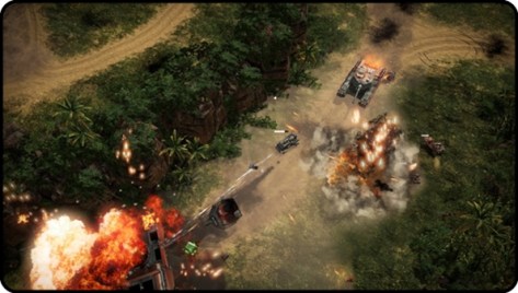 The carnage is unleashed on a tropical island, so expect winding dirt tracks through jungles as you destroy enemy bases. Enemies are varied and plentiful but never what you’d describe as swarming. They all have a handy health bar that erupts hitpoint numbers with some needing a hefty amount of damage to take down which nicely balances the game.