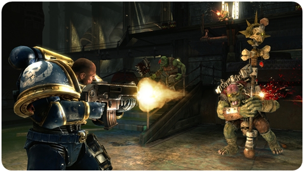 There are many visually appealing elements to the game. The industrial Cathedral architecture is unique enough to make you take notice as is the detail on a smaller scale; be in the dementedly carved armour of the Chaos Marines or the scrap yard armour of the Orc leader, Grimskull. Relic have really nailed the looks from the excellently painted models that grace the window of any Games Workshop store as the models have so much more appeal and character to them than most other games. Even the lighting is impressive, for example, the way an illuminated door switch will reflect its green light around the contours of your armour.
