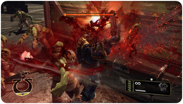 The Marines themselves are fantastically over-the-top, half of them seem to have bullets permanently wedged into their skulls, taking the ‘chicks dig scars’ ethos to a whole new level. They sound lethal as the screen shakes when they sprint, they feel lethal as they shoulder charge into a crowd splattering ork bits everywhere and they look lethal towering over most enemies, covered in blood. Mark Strong (Kick Ass, Green Lantern) adds a righteous air to Captain Titus’ (that’s you) voice. You can imagine his nose pointing upwards while recording the dialogue. The reverent tone in the dialogue is similar to a fantasy setting, as is the semi-religious take on the Space Marine. It’s strange, but makes for a nice change from overly macho scripts like Gears and Army of Two.