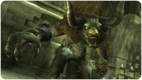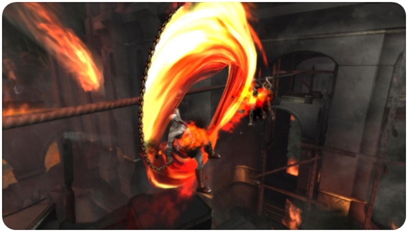 Combat is comfortingly familiar with the DualShock pad replacing the PSP. Dodge rolling returns to the right stick, but you can also use R1 and L1 in conjunction with the left stick if you’re strange and prefer the PSP way. This method gets in the way in Ghost because your fire mode (Thera’s Bane) for melee is activated by holding R1, and L1 is your combat modifier, making for lots of unintentional rolls instead of a Cyclone of Chaos. Also, sticking with the d-pad for magic attacks is a annoying considering L2 and R2 are warming the bench. Minor foibles aside, you can’t help but love Kratos’ ridiculously cool moves. His chained blades whirl around the screen eager to tear through flesh again and again, begging for higher and higher combo counts.