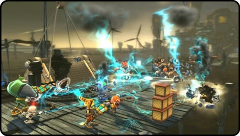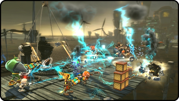 Vehicle sections require all players to steer. A flying taxi has players running from side to side and a large water raft needs directional steering switches to be pulled to avoid mines. Tether jumps can link up four players at once, with the bottom player having to jump off first. This is probably the most annoying co-op action in the game as it’s slow and confusing, especially when one player has no idea the rest are waiting for him to jump. At checkpoints individual bolt totals, enemies killed, etcetera are totalled up to add a competitive edge to the game. It also means that there’s a mad stampede every time crates are spotted.