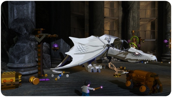 The coin currency is thrown at you constantly. Beating enemies, lighting a wall-torch, shaking a tree, any sort of interaction rewards you in studs, which can then be used to purchase unlockables. Extra characters, students in peril, Hogwarts crests and gold bricks are amongst the other collectibles that will have you combing and blasting every inch of the schools, forests, London and Diagon Alley. There are also bonus red bricks that will give you permanent stud multipliers, digging boosts and so on.