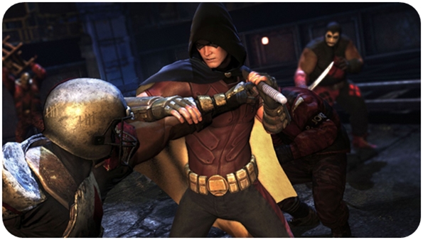 As far as gadgets go, you can tell Bruce and Alfred just supply him with the leftovers. Sure he’s tried to make up for it with a zip kick move that attaches the horizontal grapple to an enemy so he can launch himself at them for a powerful kick, but when you look at the contents of his belt compared to Batman’s you feel a bit cheated. He has laughably-shaped shurikens instead of batarangs, explosive gel and smoke pellets.