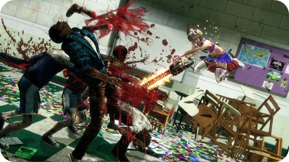 Like most zombie games, there isn’t a lot of explanation. There are zombies, zombies are pests, let’s re-kill them all. You play as Juliet Starling, head-cheerleader slash pro-zombie chopper, and must clear up the undead mess. All on her eighteenth birthday too, yes Suda-san, we get it – she’s barely legal.