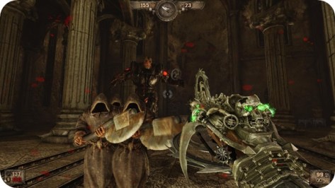 Death hands Daniel the only true new weapon in Painkiller: Hell & Damnation, the Soul Catcher. A shuriken launcher with a secondary fire that leeches the souls from enemy bones. It’s a little slow, but you don’t have to use it as souls can be picked up on foot after killing enemies with any gun. The visual design of the weapon is almost laughably over-the-top. It’s all spikes, spinning parts and skulls making it a bit like a try-hard Goth decoration, but OTT feels right for the game.