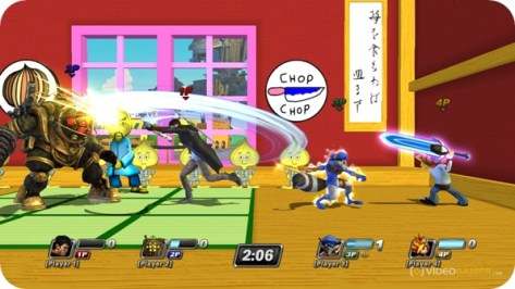 Button bashing alone won’t make you a winner, as it’s all about the kills and you can only kill using a special move. Specials have to be earned by filling a metre with regular moves up to one of three levels. Each character has different specials, with varying ranges or areas of effect, which you’ll have to learn to avoid wasting them. The higher the level, the more effective the special. Save up for a level 3 special and you can expect to bag multiple kills as you gain one hit kill abilities with your opponent’s mobility also hampered in some way. For example, Raiden’s forces everyone into a cardboard box and Big Daddy puts everyone underwater.
