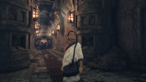 Explain Trico’s awful responses/controls on animal realism all you want, but there’s nowhere to hide when trying to fathom the horrendous controls on foot when exploring without him. Running up narrow windy staircases sees you hover away from the walls towards the abyss as you fight against invisible collision detection demons. The platforming is haunted by the violent predilections of the camera. Climbing on Trico himself is ridiculously awkward. Things get considerably worse whenever you have to interact with an object. Mere tasks like moving crates come with all the grace of trying to push a three-wheeled shopping cart around with your chin.